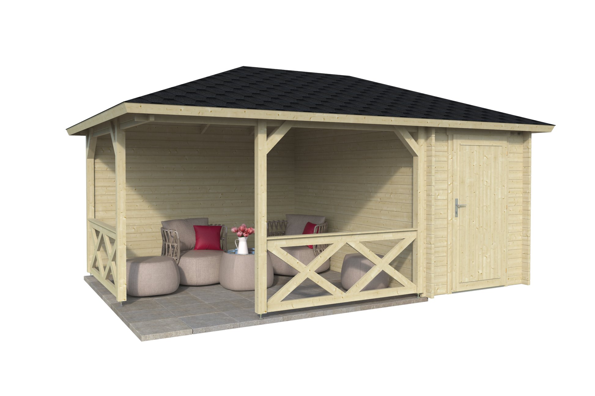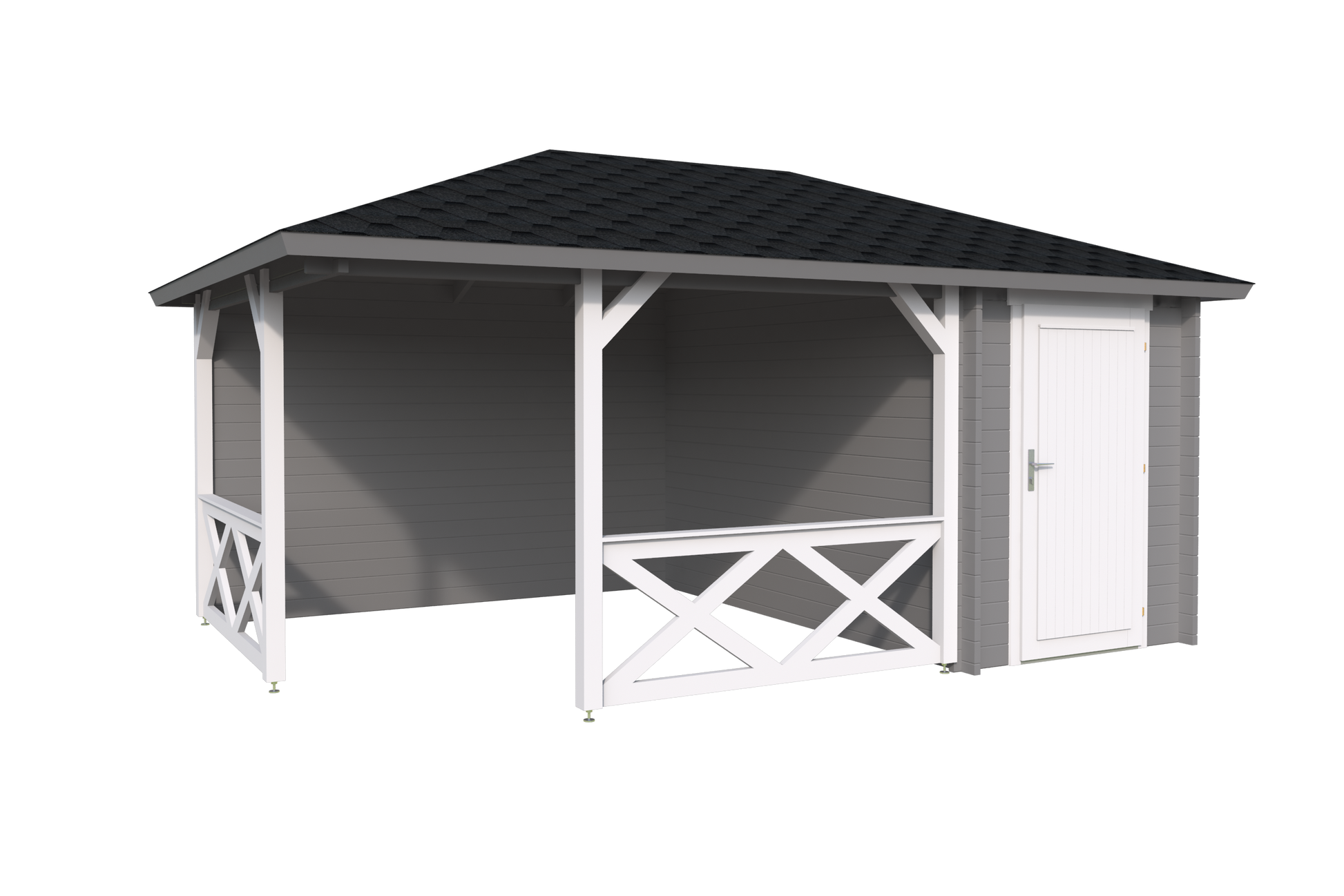 O Alfred Pavilion é uma estrutura exterior elegante e funcional, ideal para acrescentar sofisticação e utilidade ao seu espaço ao ar livre. Construído com madeira de abeto de alta qualidade, este pavilhão oferece um espaço convidativo para relaxar, protegendo do sol e da chuva. O design aberto com detalhes laterais em cruz proporciona uma sensação de ligação com a natureza, enquanto o telhado inclinado garante excelente escoamento de água. Disponível em várias cores, incluindo madeira natural e acabamentos pintados, o Alfred Pavilion adapta-se ao seu estilo e necessidades.