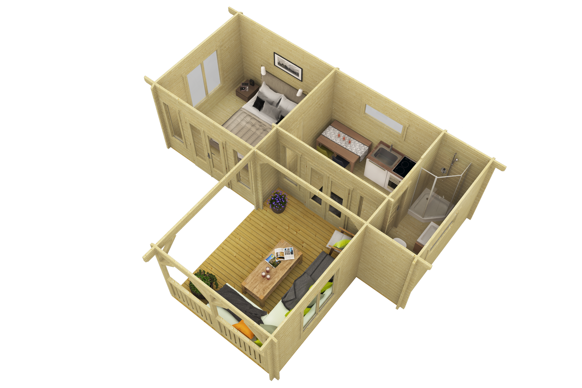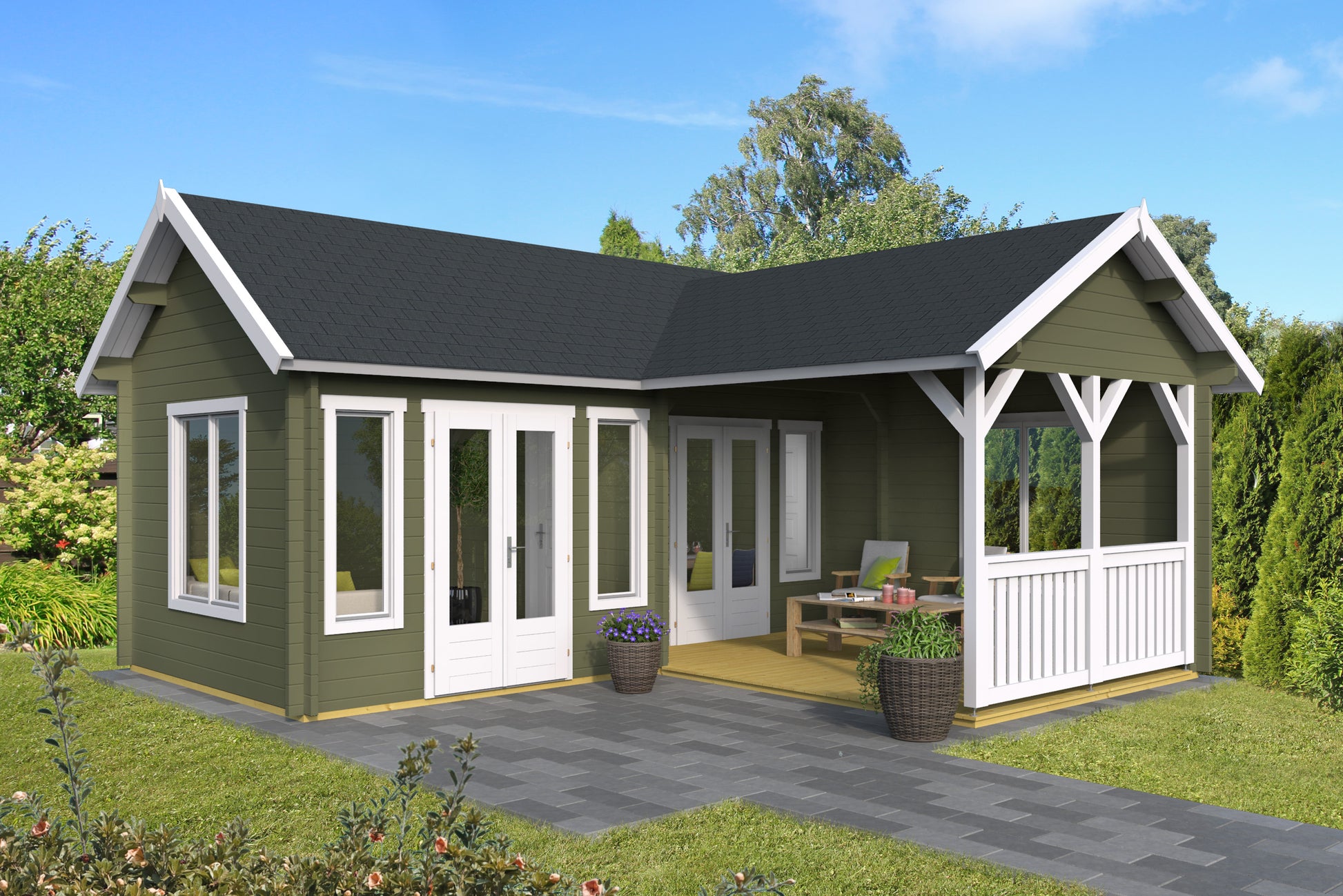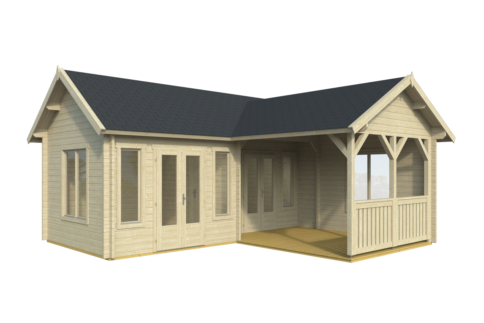 A cabana de madeira Karl é uma estrutura versátil e espaçosa, ideal para múltiplos usos como escritório em casa, casa de hóspedes ou refúgio tranquilo no seu jardim. Com uma área total de 32 m², apresenta um design único em L que combina zonas interiores amplas com um espaço exterior coberto. Construída com madeira de abeto nórdico de alta qualidade e proveniência sustentável, a cabana alia durabilidade a um aspeto elegante. As grandes janelas e portas garantem uma iluminação natural abundante, criando um ambiente acolhedor e funcional.