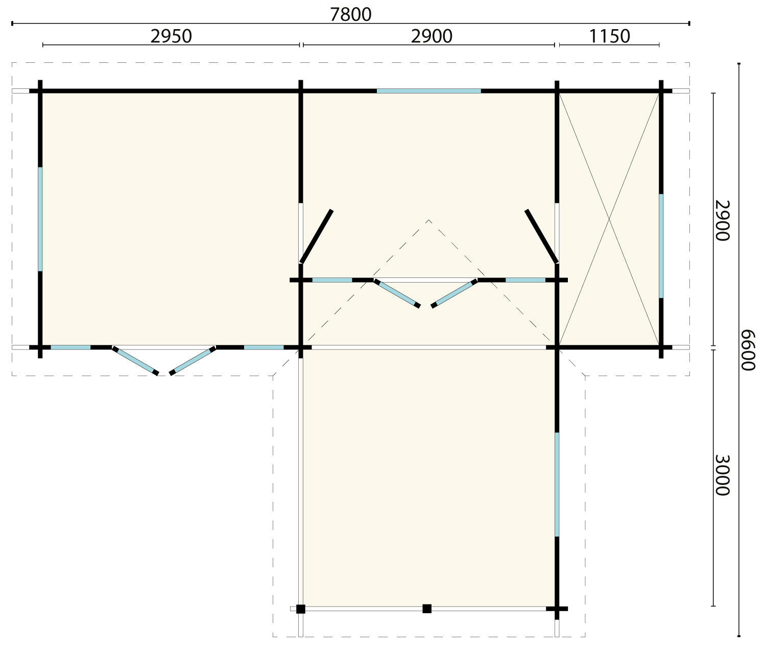 Dimensões exteriores: 7,8 m (comprimento) x 6,6 m (largura) x 3,2 m (altura)