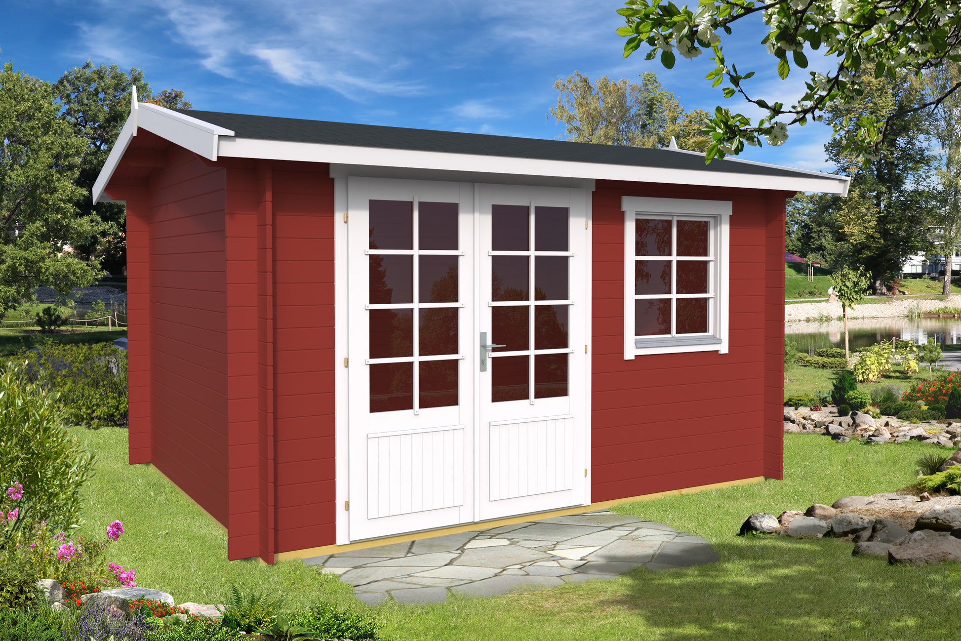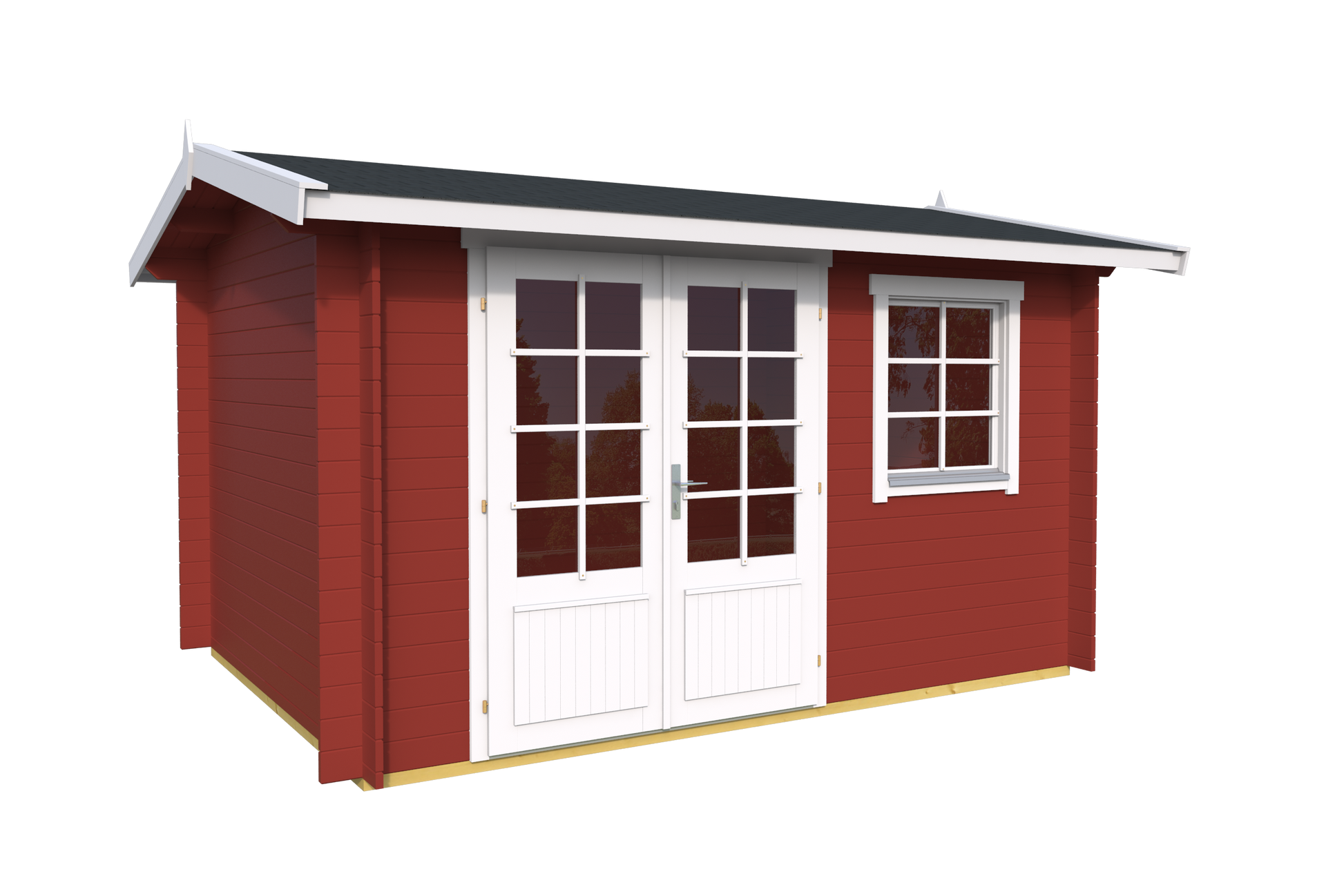 O seu design tradicional com telhado de duas águas e portas duplas largas confere-lhe um aspeto acolhedor e intemporal. Fabricada com madeira maciça de 40 mm de espessura, certificada pelo FSC, garante um excelente isolamento térmico e elevada durabilidade mesmo em condições meteorológicas exigentes.